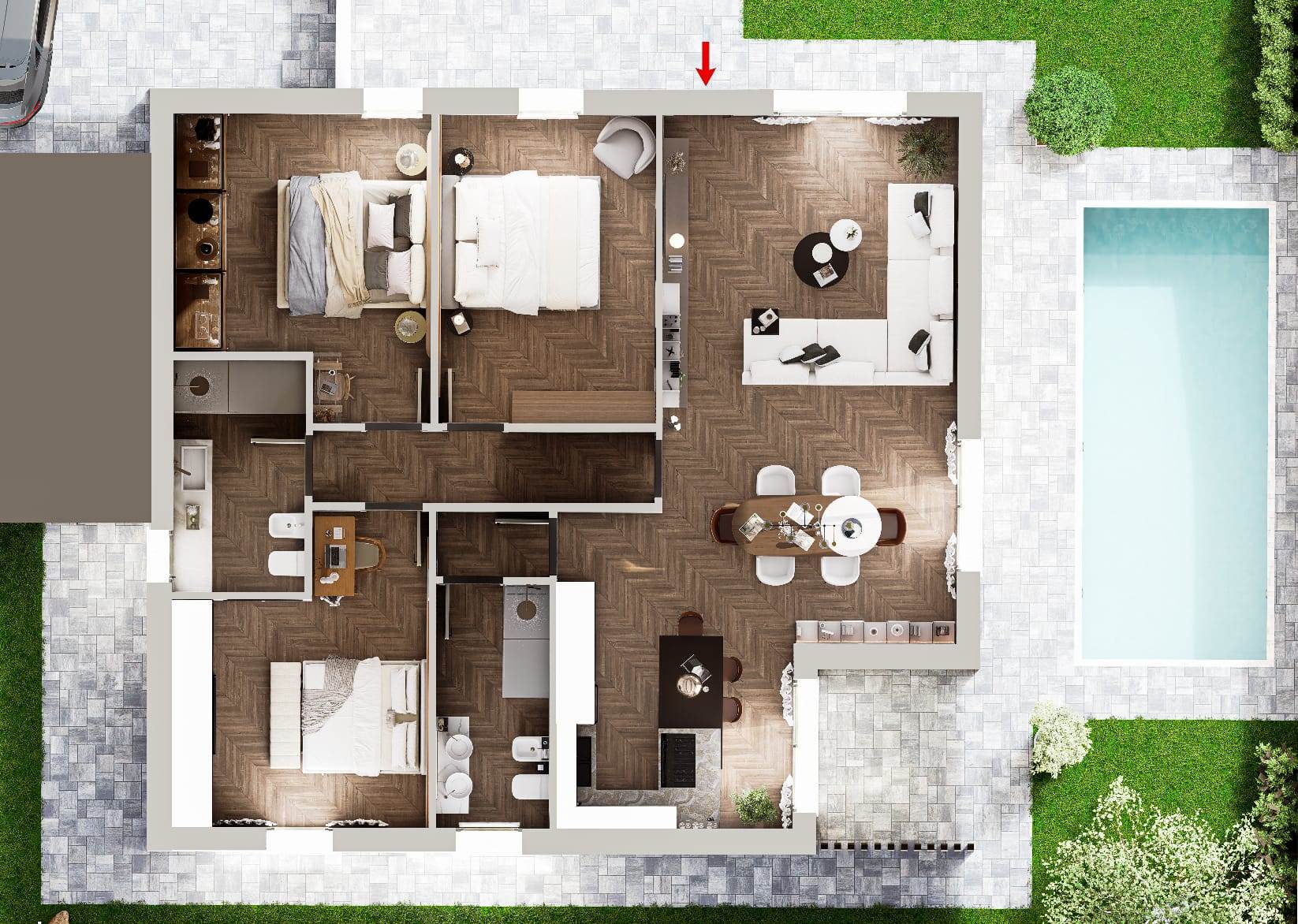 Gli interni, studiati con grande attenzione, prevedono una luminosa zona giorno con cucina a vista, ideale per trascorrere momenti indimenticabili con amici e familiari. Le tre camere da letto assicurano ampi spazi dedicati al relax e alla privacy, mentre due bagni moderni e funzionali offrono praticità e comfort per tutta la famiglia. È inoltre presente una lavanderia spaziosa e ben organizzata, pensata per semplificare la vita quotidiana.